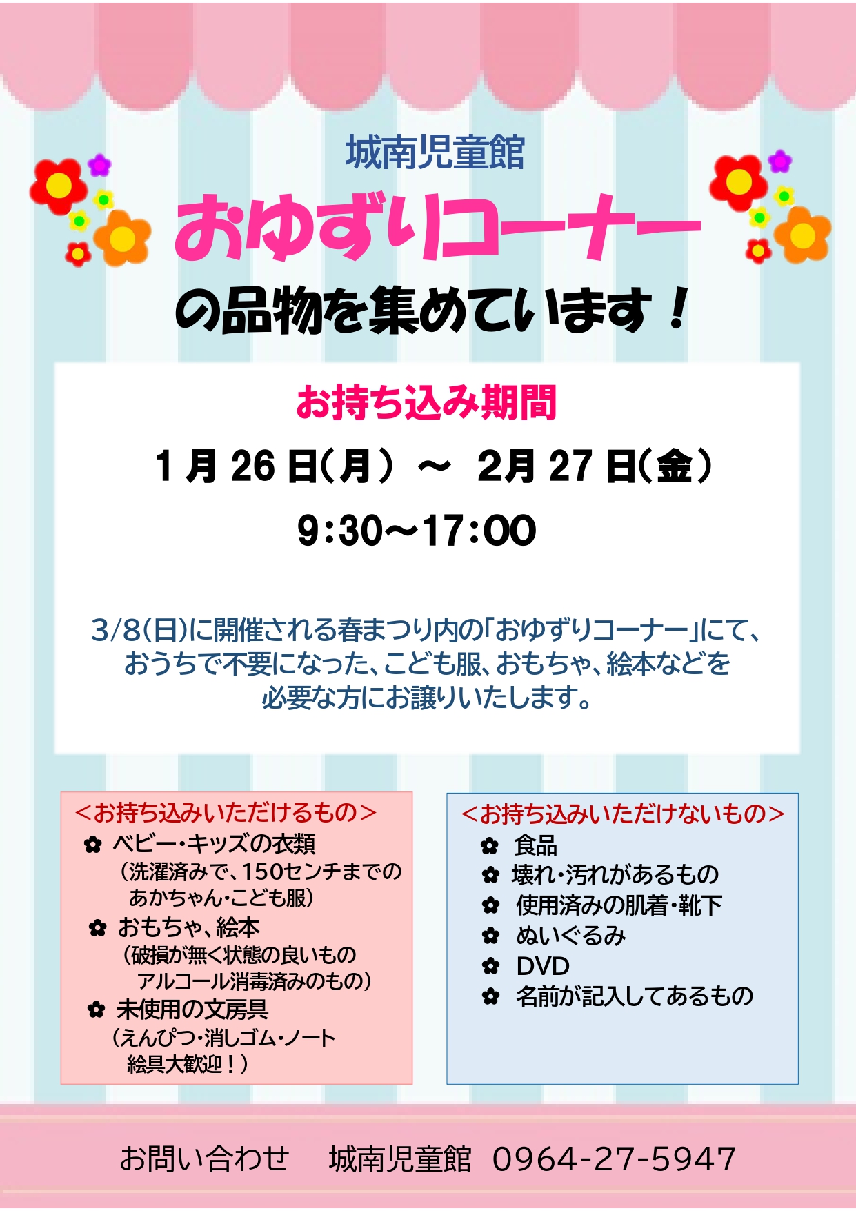 3/8(日)に開催される春まつり内の「おゆずりコーナー」にて、おうちで不要になった、こども服、おもちゃ、絵本などを必要な方にお譲りいたします。